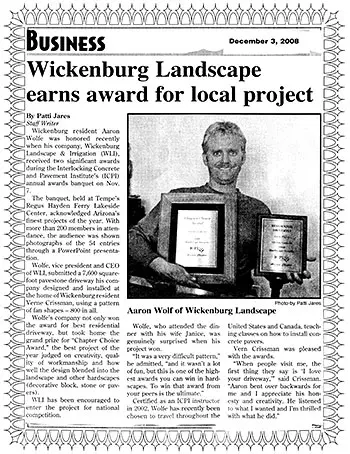 Wickenburg resident Aaron Wolfe was honored recently when his company, Wickenburg Landscape & Irrigation (WLI), received two significant awards during the Interlocking Concrete and Pavement Institute's (ICPI) annual awards banquet on Nov. 7.