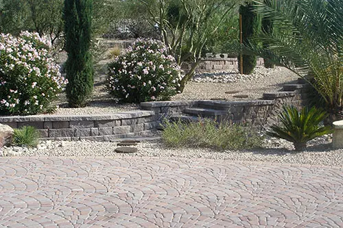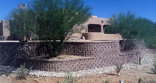 This project was designed to address the concerns of integrating an ornate Tuscan style house into the natural Sonoran Desert which surrounds it. The client’s foremost concern was to preserve the “rustic desert” feel from a distance while complementing, with lush landscaping, the area that surrounds the house. The initial phases were designed to add structural support and a sound footprint for the concrete paver driveway, while the final phases were added to enhance the beauty of the landscape. Throughout this project our continuing challenge was to harmonize the up close and personal feel that accompanied this style of the house with a simple and yet almost undisturbed desert which surrounded the project. Protecting the surrounding desert was of particular importance because one wrong move with a piece of equipment would have caused irrevocable damage, and the ground could never be returned to its original state. Our client, who is local custom homebuilder, was so encouraged by what can be done with segmental retaining wall blocks that he has gone on to incorporate them in his future projects. We believe these creative uses of segmental retaining walls, such as this project, help to redefine our industry. Continuing to push the design envelope we feel that these products in our industry have only touched the tip of the iceberg on how we can creatively add structure and character to almost every project we encounter.